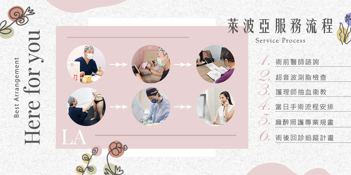 萊波亞美醫診所具備專業醫療團隊與先進設備,每一位客戶皆會安排醫師親自進行詳細謹慎的諮詢評估,並使用超音波測量脂肪厚度,提供專業與量身規劃的方案建議。以客戶服務為第一優先,從線術前醫師諮詢、超音波測脂檢查、護理師抽血衛教到手術當日的流程安排與麻醉照護,再到術後回診追蹤計畫,皆有嚴謹的人員訓練與 SOP 規劃。注重客戶體驗,不強迫推銷療程、不誇大療效,人員將心比心、親切有禮,站在專業的角度提供合宜的建議。