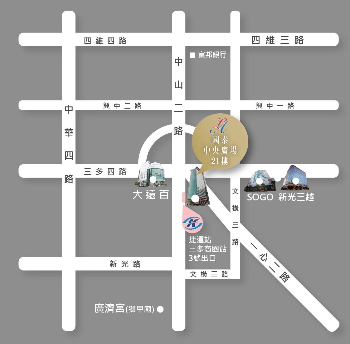 高雄捷運紅線三多商圈(R8)站3號出口之左側國泰中央廣場大門進入,搭電梯至21樓即可到萊波亞美醫診所。