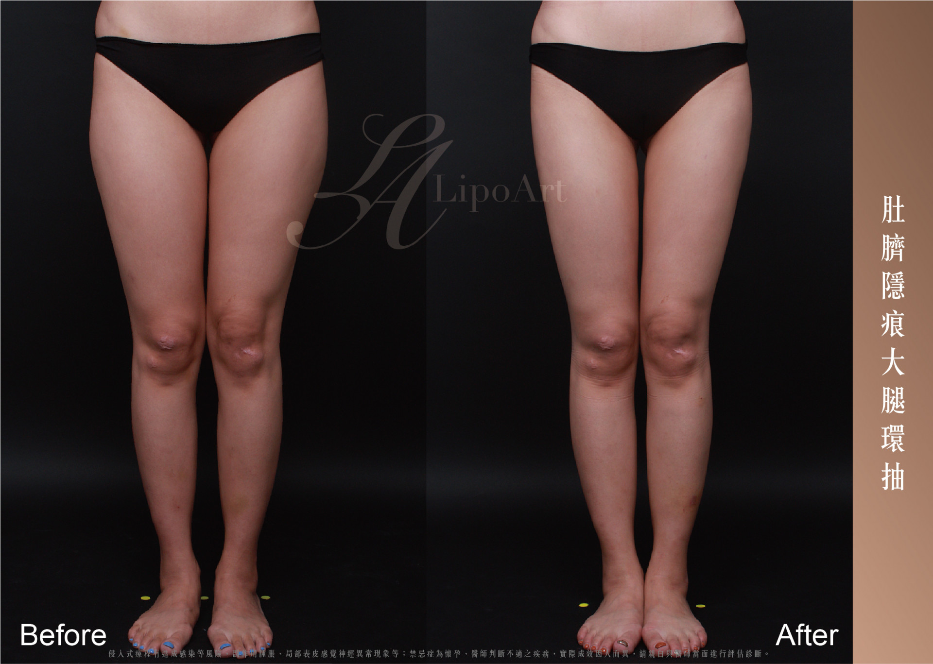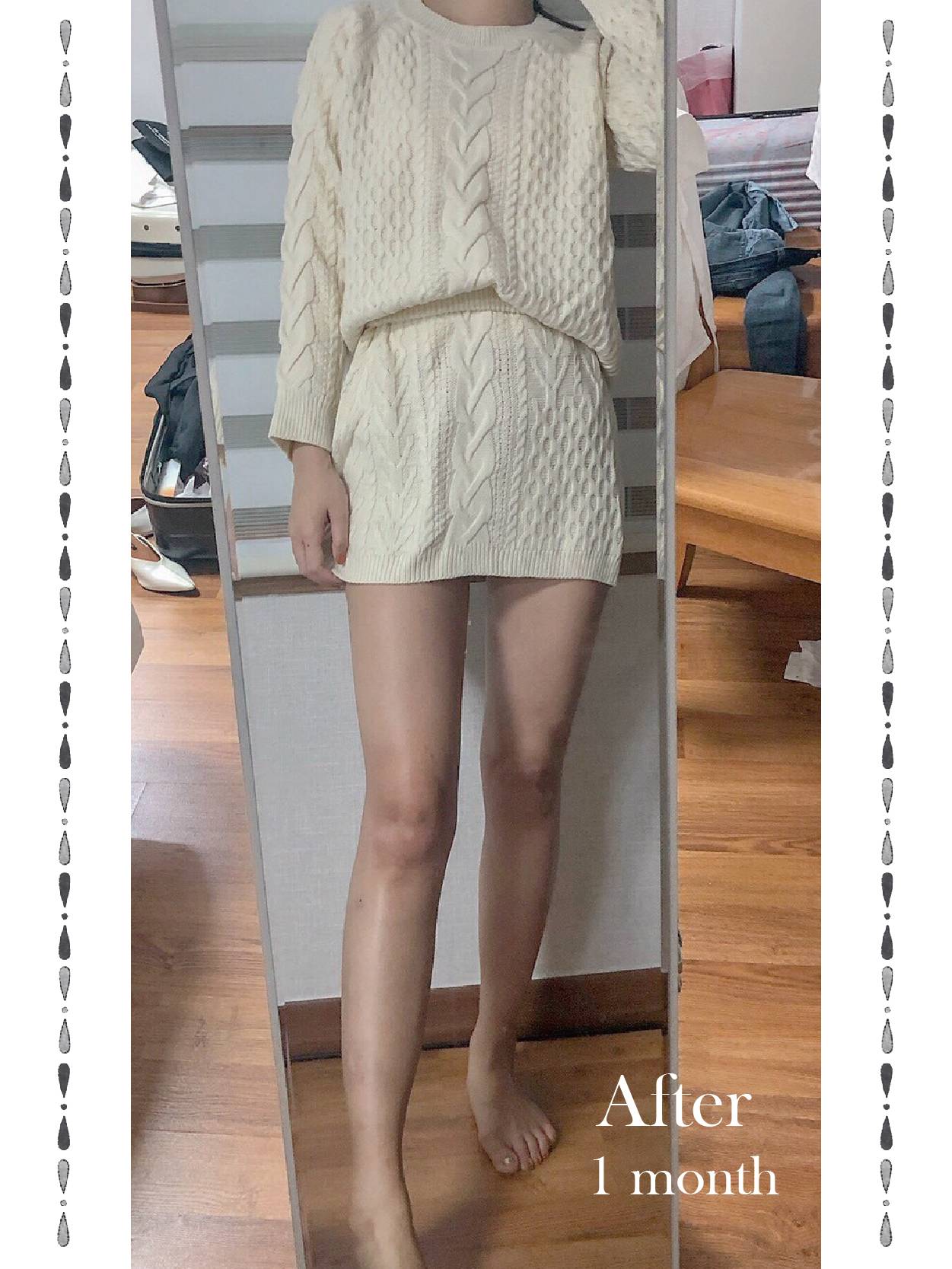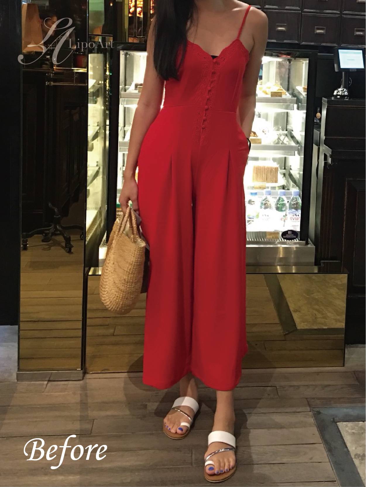 ▲術後正面紀錄(右) : 術後皮下脂肪層均勻變薄,使整體線條平滑柔順,比例更為挑高、修長。
