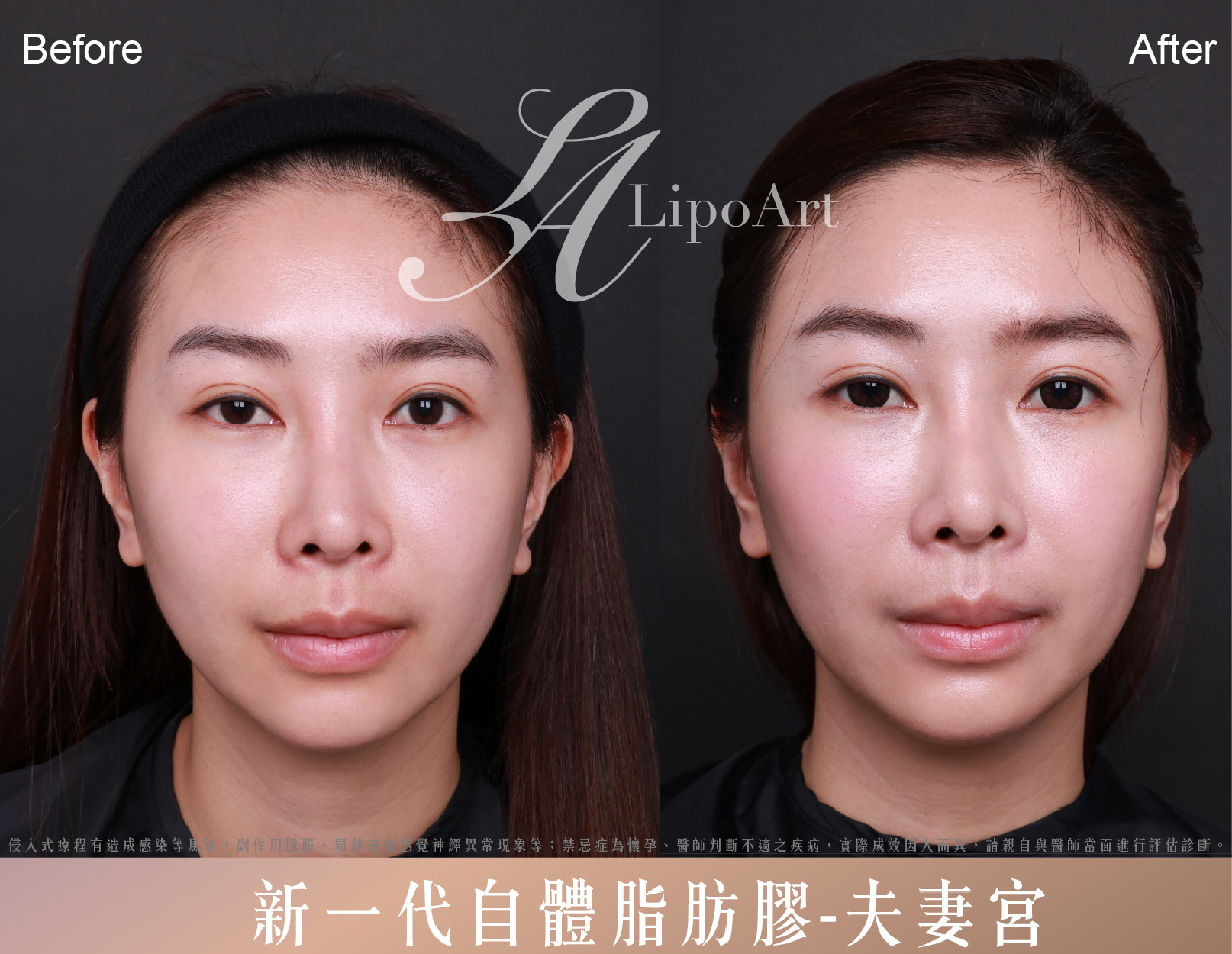 ▲ 術後正面紀錄(右):術後透過自體脂肪膠填充在凹陷的夫妻宮(太陽穴)之處,整體臉部線條更柔和。
