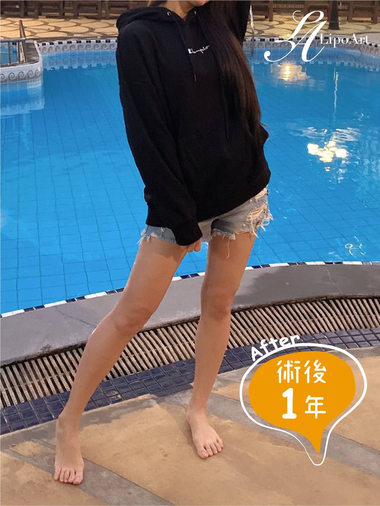 ▲ 術後正面紀錄(右):術後將局部脂肪移除,大腿外側馬鞍部分及內側明顯往內縮,