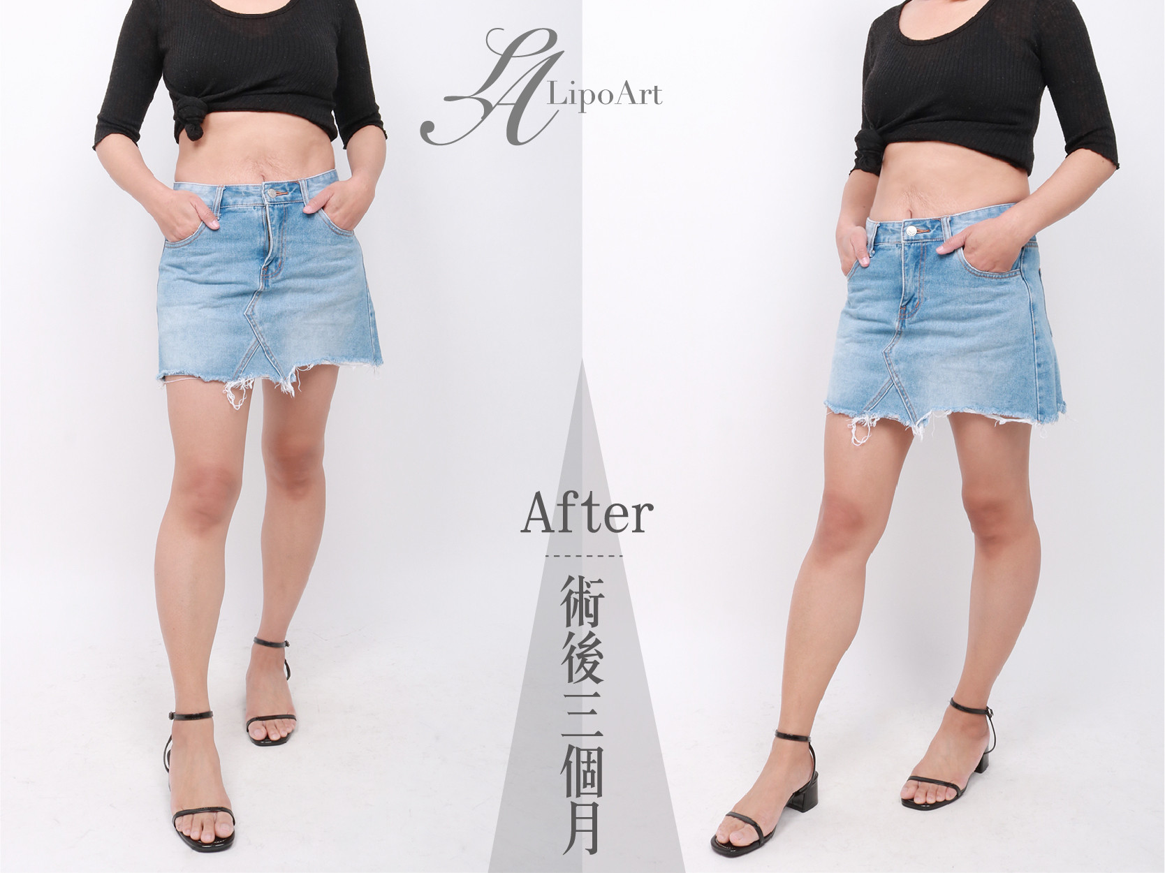 ▲術後整體紀錄(右):透過第四代電波拉提,使腹部肌膚獲得拉提,產後造成的下垂與抽脂後的鬆弛部位得到顯著改善,整體線條也更為緊實。