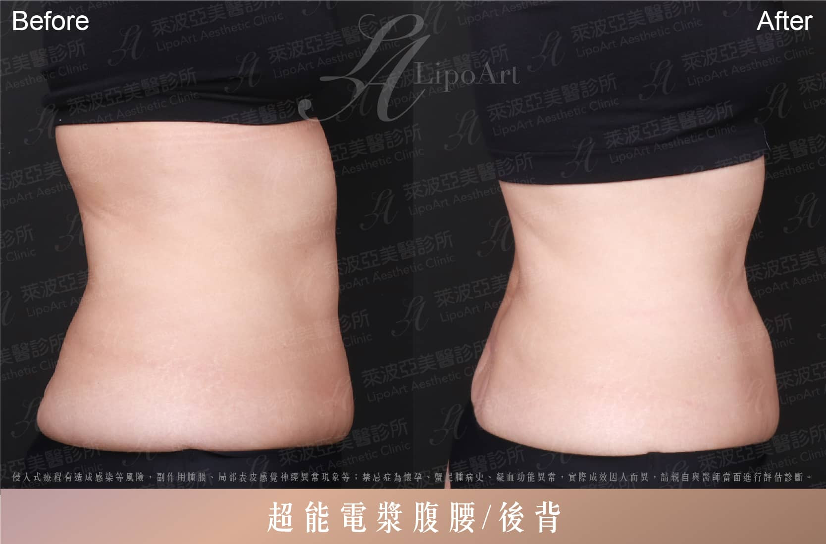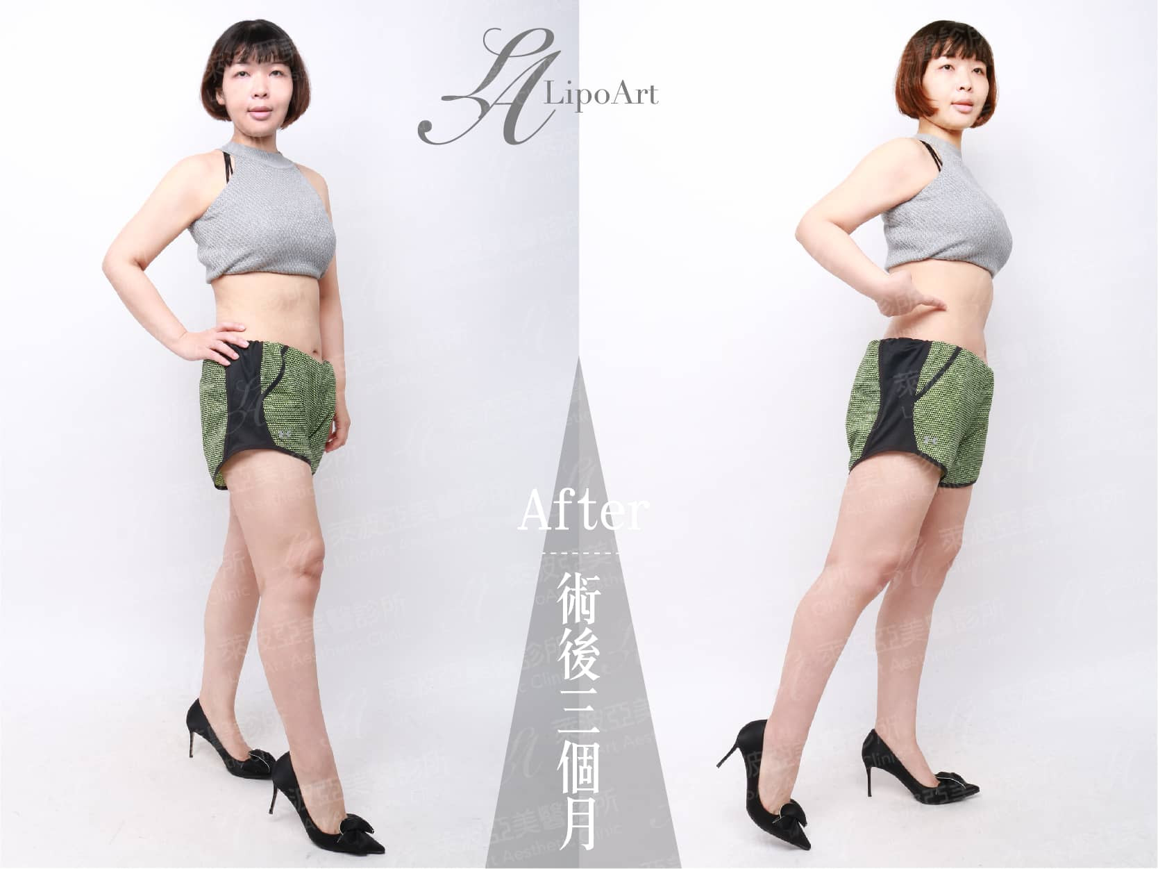▲術後側面90度紀錄(右):可看出上腹明顯收緊,凸起的下腹內縮,原本下垂的下背肉與突出的臀上肉也收回去,背部皺褶不僅獲得顯著改善,也讓整體腰圍縮小,腹部川字線條陰影更顯深邃。