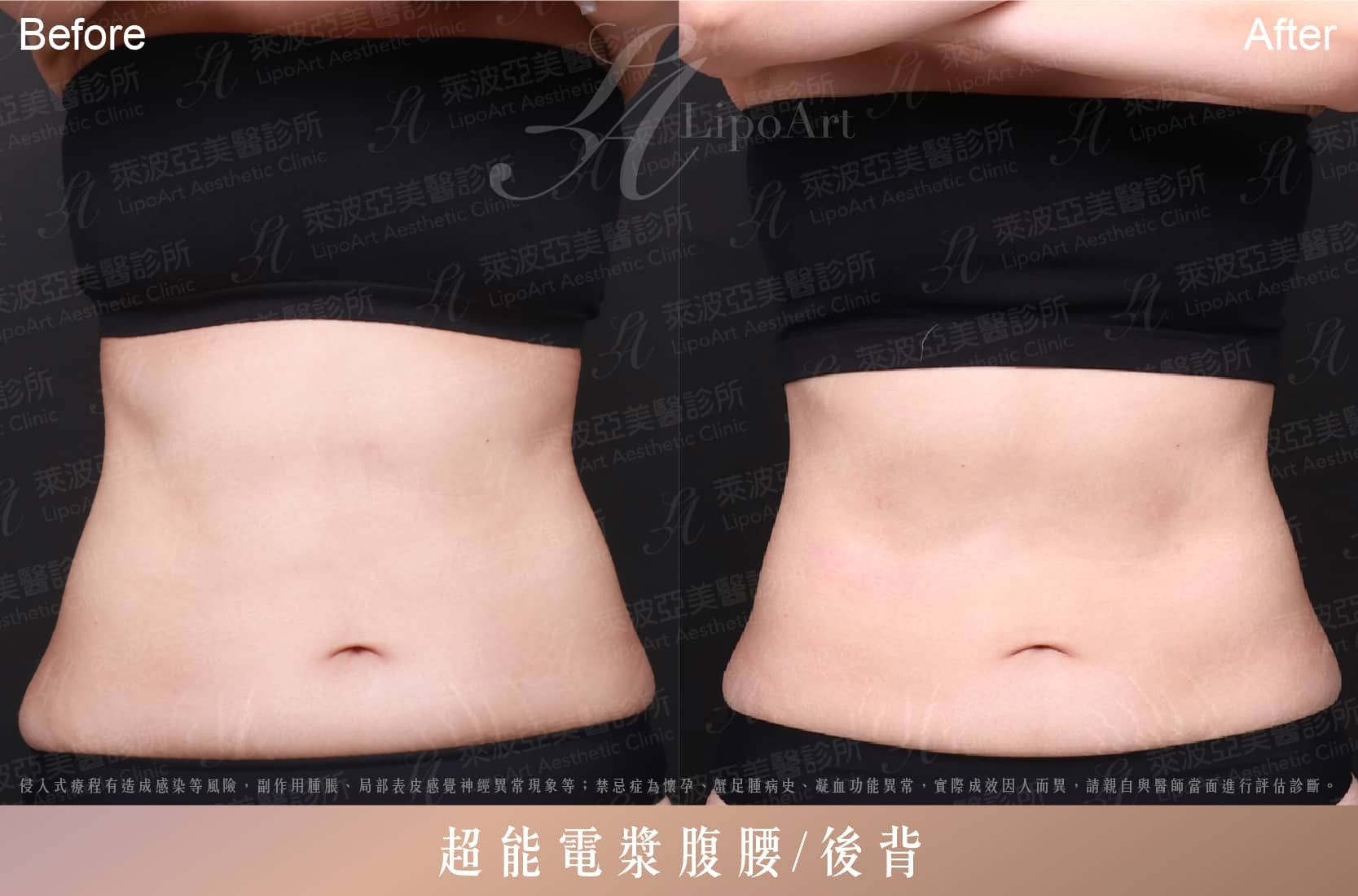 ▲術後正面紀錄(右):上腹明顯收緊,下腹變得平坦,由上方沿伸下來的人魚線條陰影加深,使整體視覺效果更加緊緻有形。
