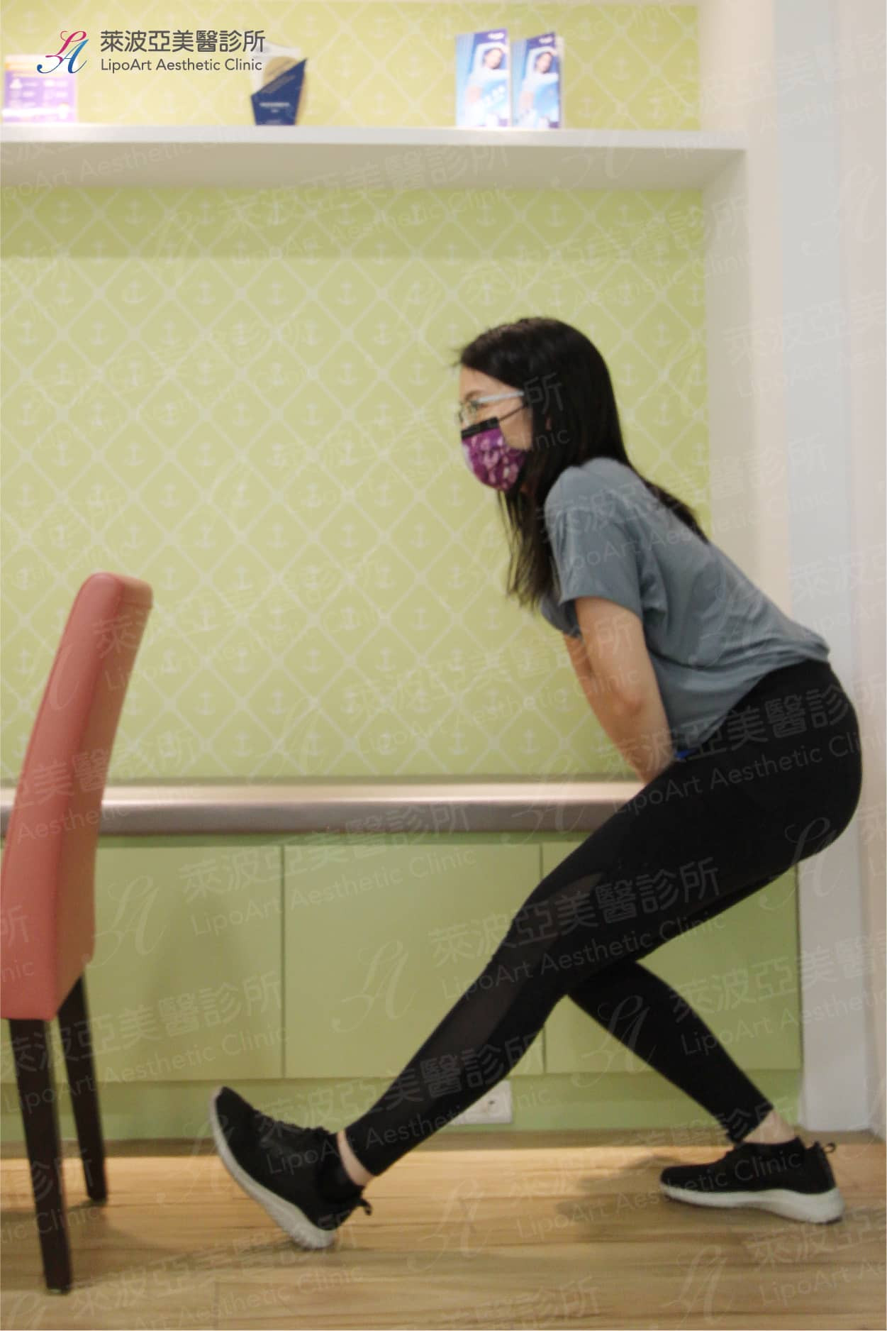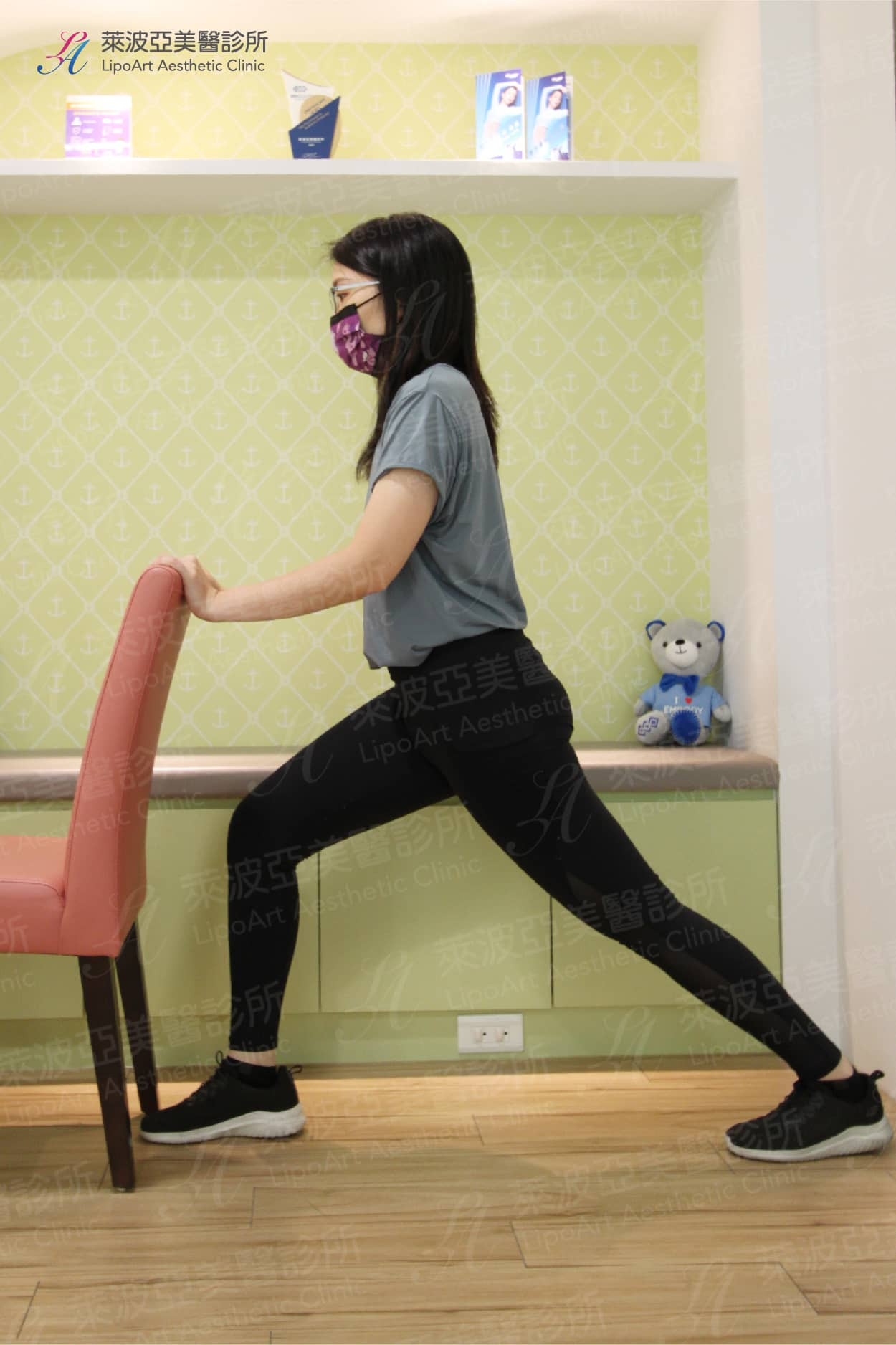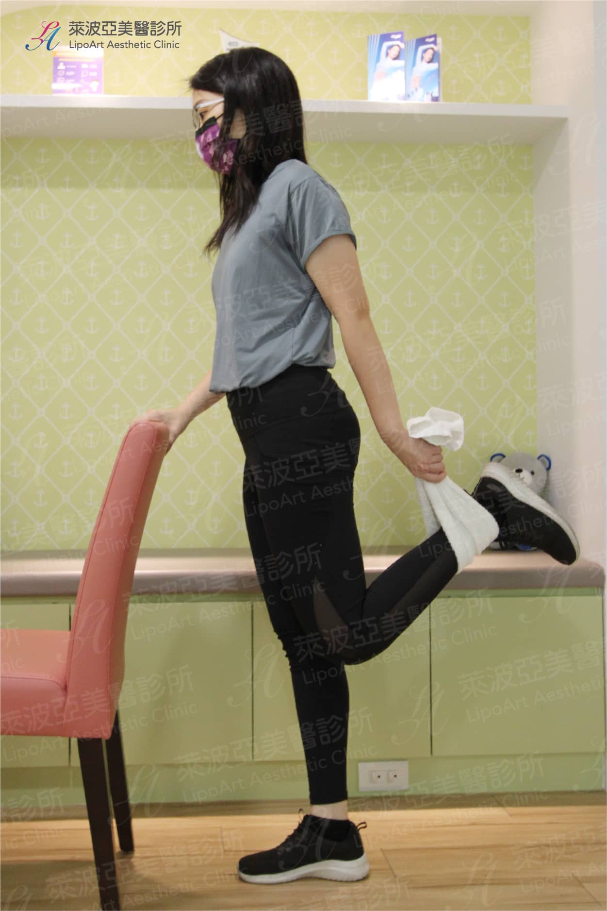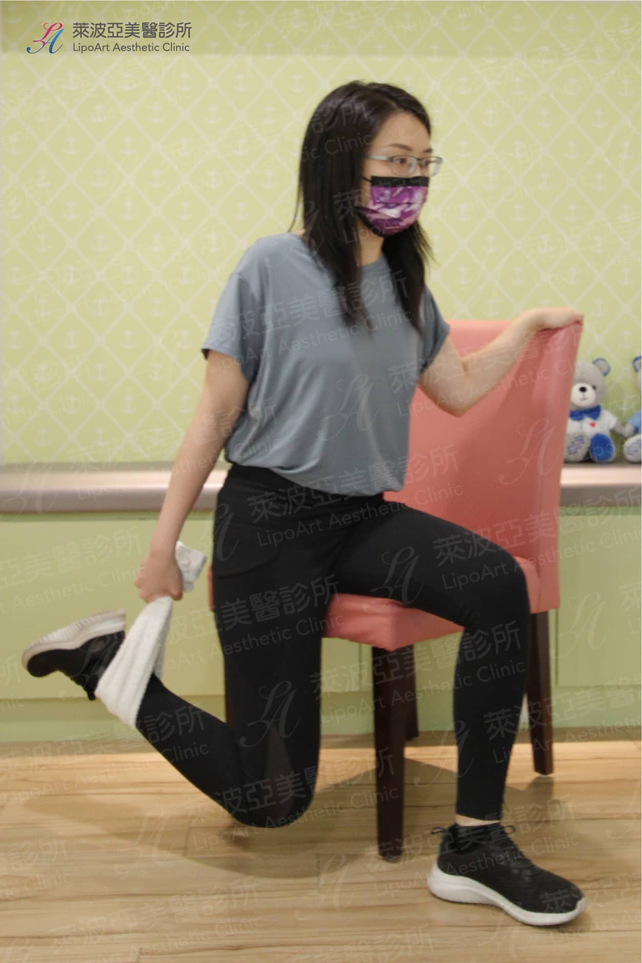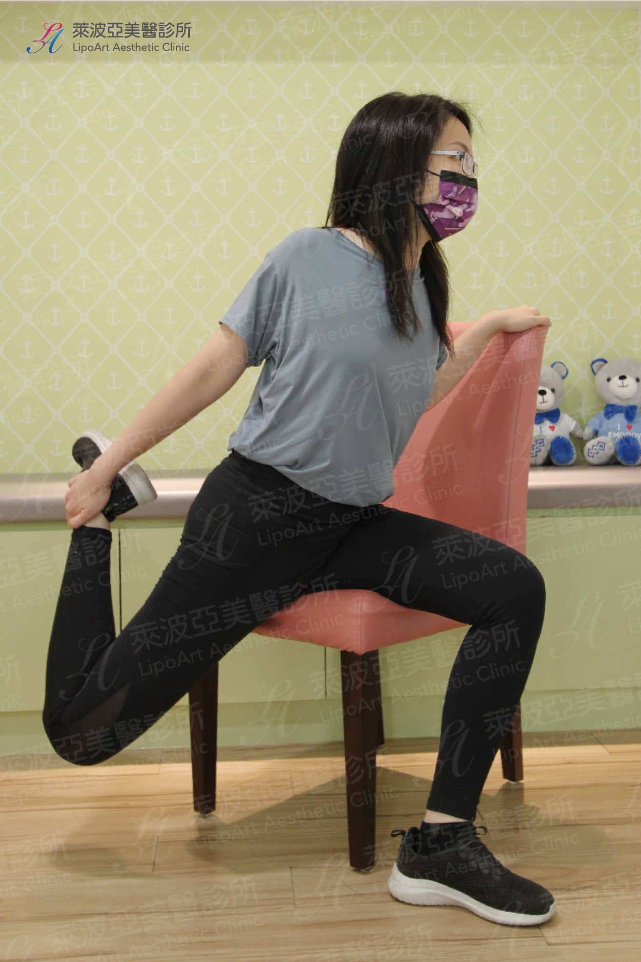 - 坐姿/站姿膝後彎(個人可視身體狀況二擇一):伸展股四頭肌