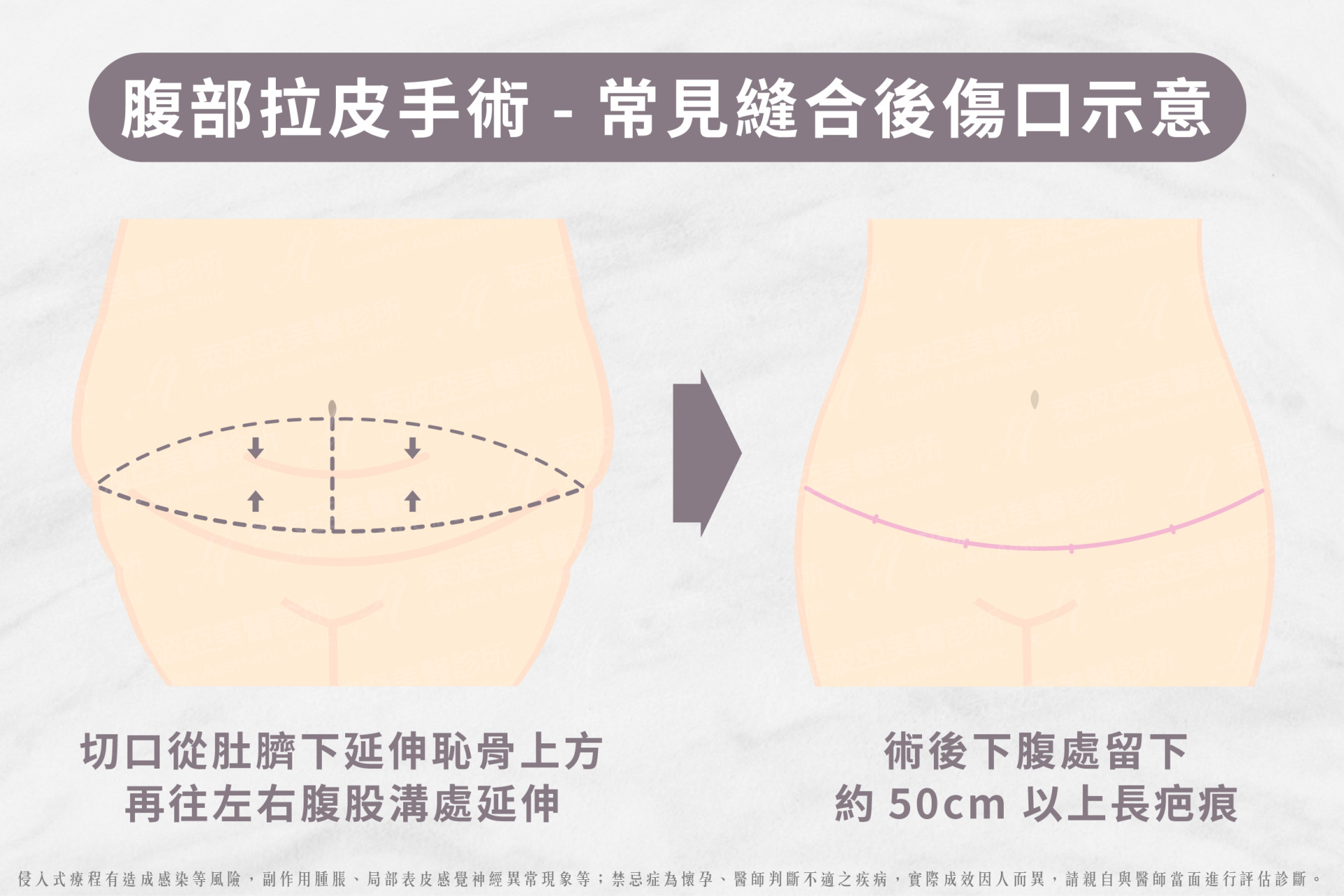 因此不可避免的,術後下腹處會留下一道約 50 公分以上的長疤痕,即使穿上內褲能遮擋,但仍無法避免需與這道明顯的長疤痕終身共處,讓很多人對「拉皮手術」望之卻步!