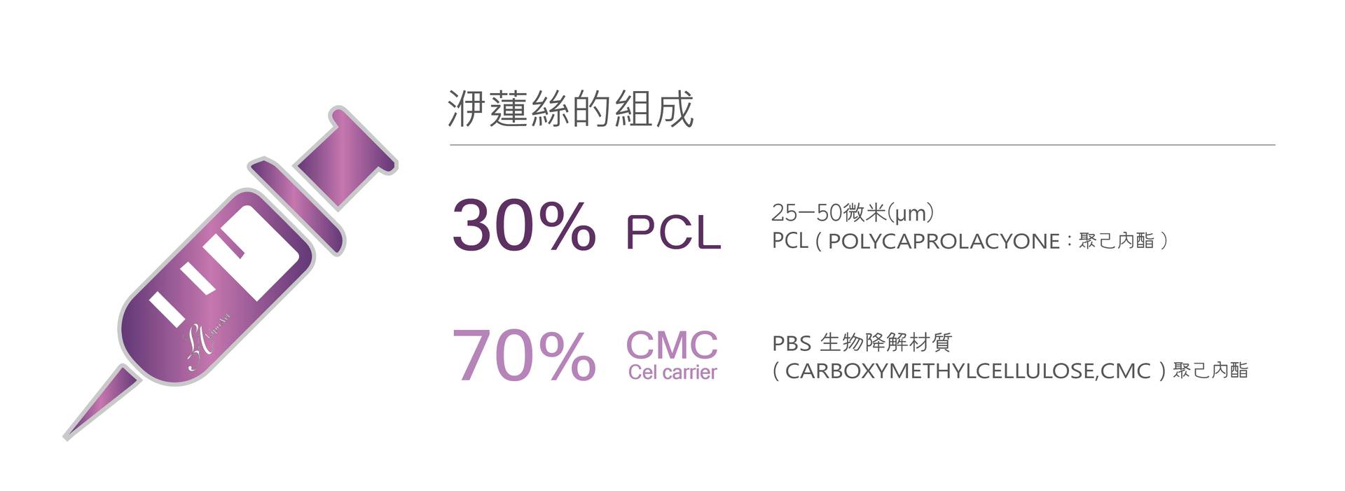 聚己內酯(PCL)是洢蓮絲重要成分,數十年以來作為骨科植體、手術縫合線、臉部填充物等可被人體吸收的植入物,後來因其有助於合成膠原蛋白之特性,因此科學家研究並運用於美容醫學療程中。而CMC凝膠載體內包覆聚己內酯(PCL),注射至皮下組織,PCL隨著注入的CMC凝膠均勻的浮起、分布在各層,撐起因老化流失、塌陷的組織,能暫時支撐凹陷的地方,當下即可改善皺紋、凹陷,隨後PCL刺激膠原蛋白新生,取代被吸收的凝膠載體,最終看到澎潤滑順肌膚為自己生長的膠原蛋白效果。