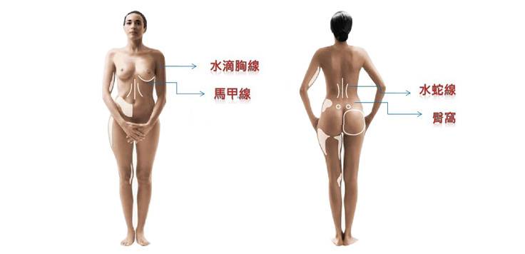 | 腹部抽脂 傷口 | 藏會陰、股溝 | 可能在肚臍上緣、下腹部、比基尼線(鼠蹊部)、 腰側、後背、股溝、臀外側等。 | |||