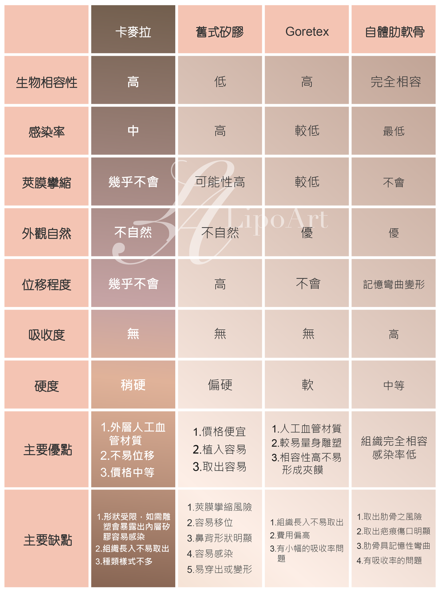 - 卡麥拉的質地相對比較硬挺(雖然新⼀代的卡麥拉⿐模在部分型號上質地有調整過,變得比較軟),優點是可以達到比較挺立的效果,但是對於部分⿐樑皮膚太薄或是⿐背空間有限(⿐樑太榻但卻希望墊很高),如果放置太高的卡麥拉⿐模,可能會出現明顯的邊緣感或是皮膚泛紅的情況。