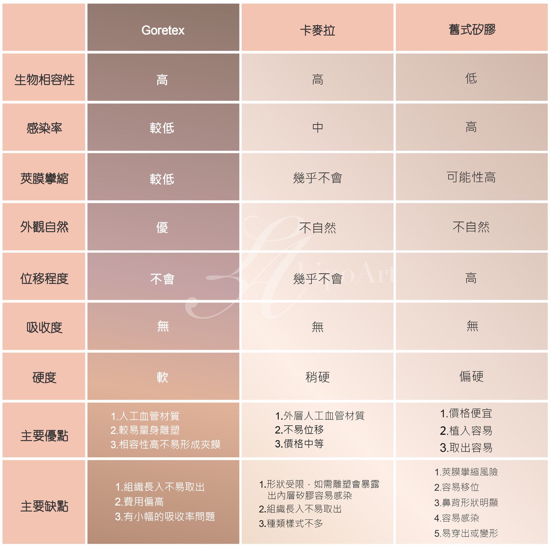 Goretex(e-PTFE)是⼀種⽣物化學性很穩定的物質,所以⼀直以來被當作是人工血管的材質,近年來則開始被使用在⿐整形手術中的人工⿐模,因其結構有很多微小的孔洞可以讓人體的組織⻑入,因此不會像矽膠⿐模那樣產⽣莢膜攣縮,同時因質地較軟,所以也比較不會有異物感。