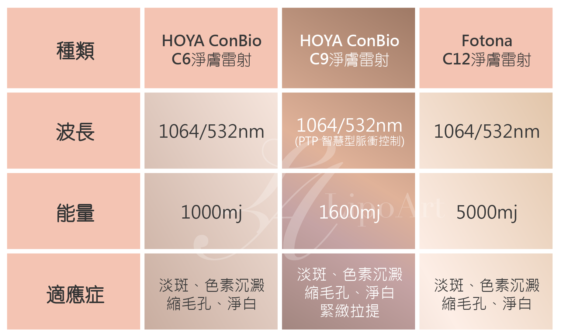 C9 淨膚雷射對黑色素良好的破壞力,治療能量及穩定度更勝上⼀代C6 淨膚雷射,C9 淨膚雷射有兩種波⻑來針對不同的斑點治療,波⻑分別為短波⻑532nm 和⻑波⻑1064nm,短波⻑用來治療表淺層的色素斑點(如:曬斑、雀斑等);⻑波⻑用來治療真皮層較深的色素斑點 (如:顴骨⺟斑、太⽥⺟斑、肝斑等),還會刺激肌膚彈性組織,改善色素斑及均勻膚色,並將肌膚底層的老廢物質進行推擠代謝動作,亦可改善毛孔粗大的問題。